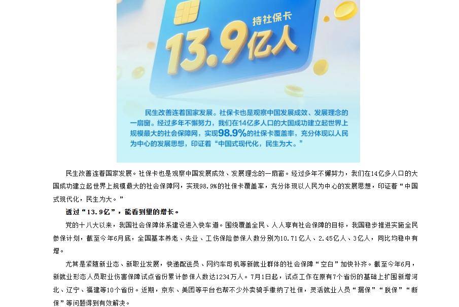 截止到今年6月,我国的社会保障卡持有人数13.9亿人,覆盖率98.9%,这代表着基本实现了全民参保计划,尤其近几年对一些灵活就业的新形态职业参保空白的补充,也大大提高了参保率。在十四五会上还提到了关于职业伤害保障,现在已经有17个省份在试点执行,不同于工伤险,职业伤害保障的参保更加灵活,还可以选择按单参保,比如滴滴等平台已经陆续开始使用了。近几年灵活就业参保难、断保问题得到了有效解决,比如提到的“一开放,三灵活”的参保政策,取消参保户籍地限制,同时使缴费方式更加灵活、缴费档位选择性更加灵活,以及参保的服务保障也更加灵活,再加上今年开始的部分地区,给予灵活就业参保补贴,也缓解了灵活就业参保的实际困难,所以多项利好政策,让我国参保人数越来越多,也让更多的人都享受到了社会保障的好处。