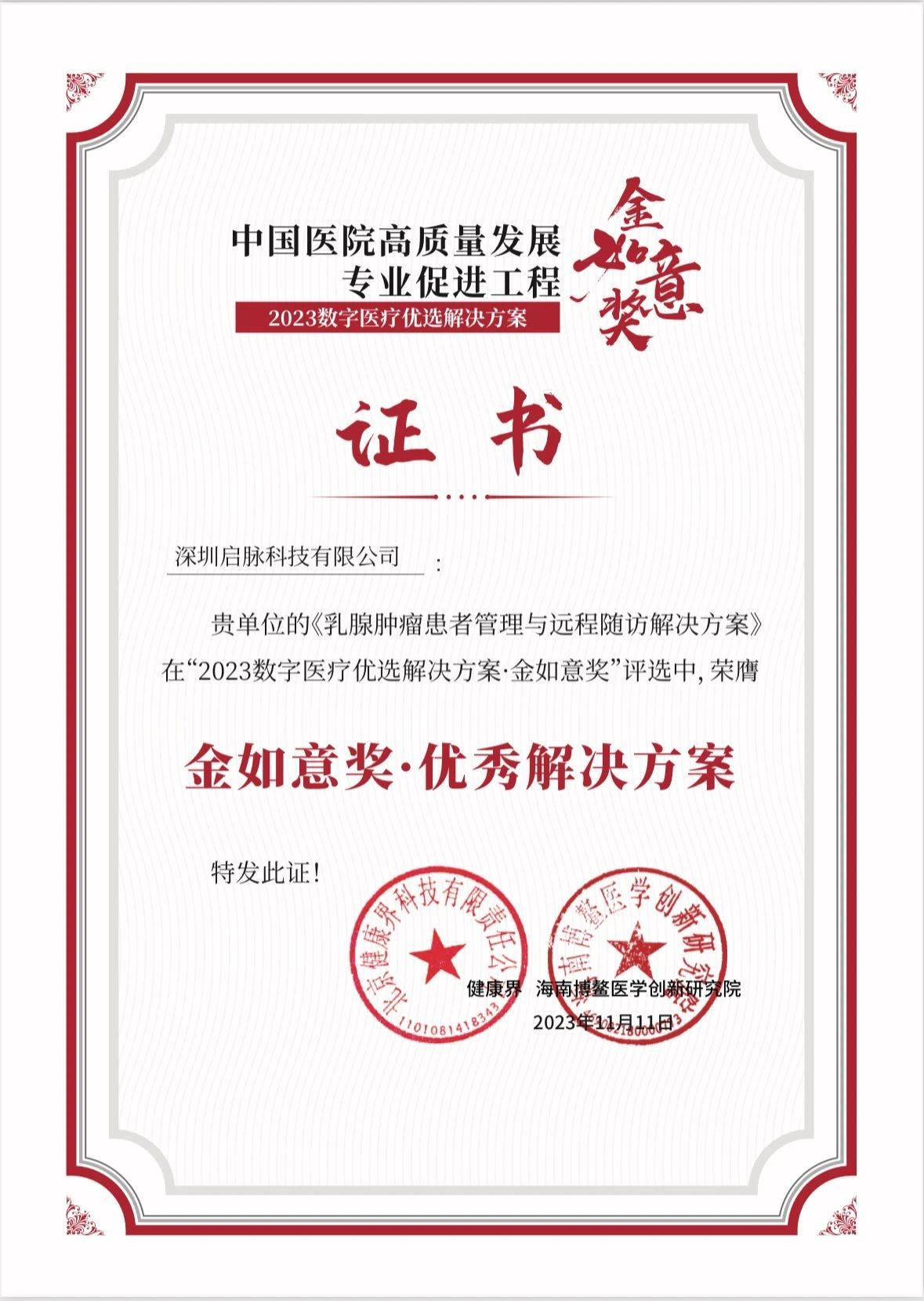 11月11日晚,第三届“金如意奖“优选方案评选颁奖典礼正式开始,本届“金如意奖“优选解决方案评选,聚焦“数字医疗”。评选于2023年7月29日启动,历时4个月的时间,共征集解决方案246个。经过189位专家评委的专业评审,40个优选解决方案脱颖而出。启脉“乳腺肿瘤患者管理与远程随访(基于新一代数字生物标志物的无线移动连续监护)解决方案”有幸摘得“金如意奖·数字医疗优选解决方案”优秀奖荣誉,获得了专业评审的一致认可。