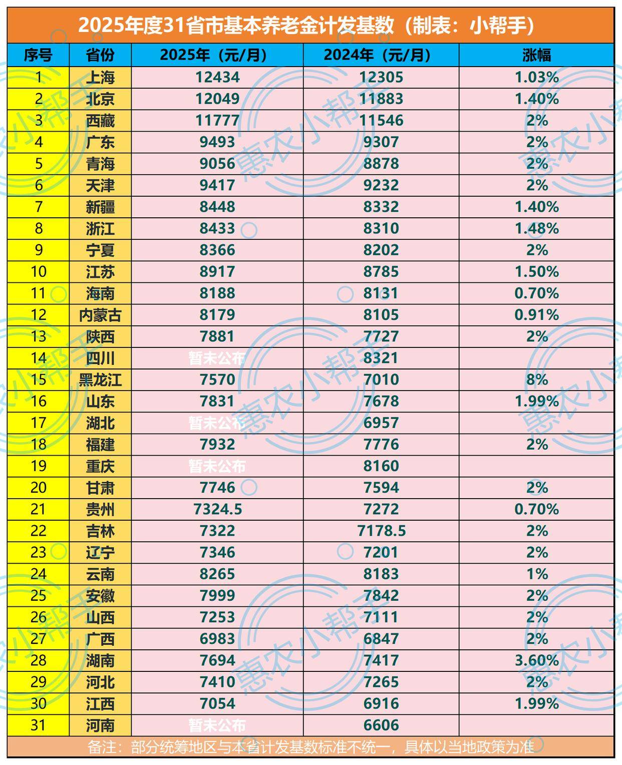 好消息是,截至目前,全国31个省市已经陆续公布了2025年度的基本养老金计发基数。例如,福建省2025年度的计发基数为7932元/月,上涨约2%。辽宁省(不含沈阳、大连)企业职工和机关事业单位的月计发基数为7346元,沈阳市为8390元,大连市为8956元。