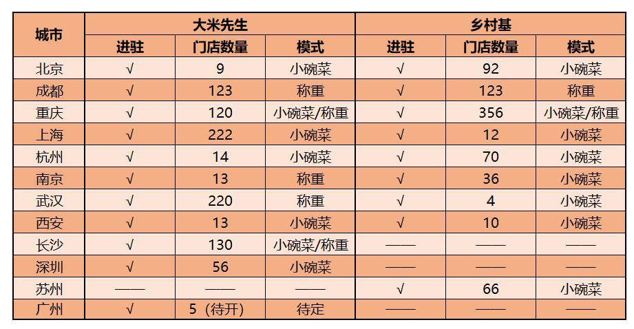 众所周知,大米先生有两种门店类型,分别是:“小碗菜和称重”。在不同的城市,大米先生会以不同的模式切入(参看下图),但也存在同一个城市有两种不同模式的情况,比如成渝两地,大米先生和乡村基的模式较为复杂,两个品牌,存在四种模型。