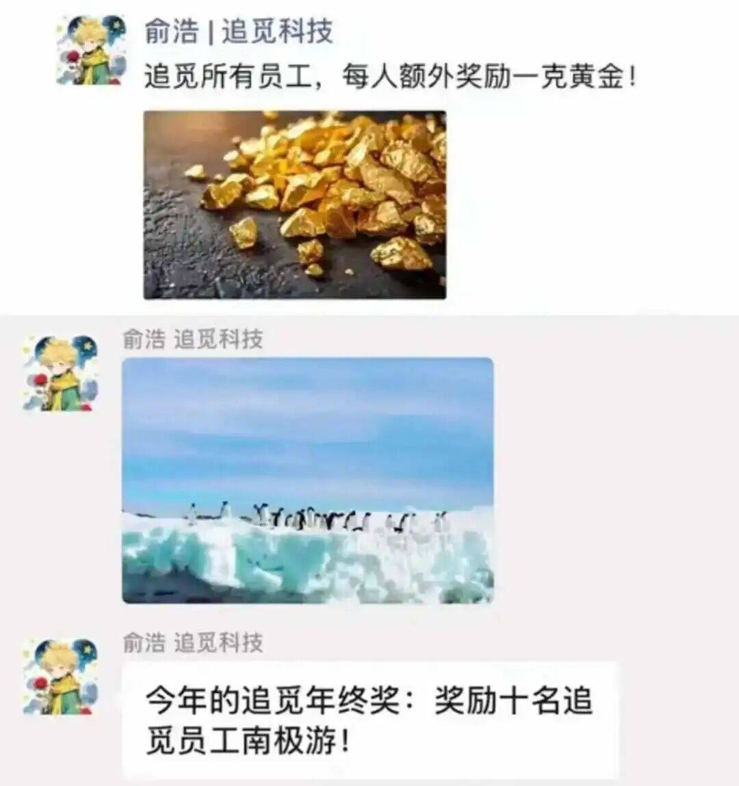 此前,追觅就曾因“全员额外奖励1克黄金”刷屏:网传内部群截图显示,在年终奖之外,向员工每人额外发放1克黄金;按截图口径推算,涉及人数约1.85万人,若以金饰克价约1400元/克粗测,总成本约2500–2600万元。随后俞浩本人在朋友圈连续发文确认“全员额外奖励一克黄金”,并提到年终奖另设“10名员工南极游”名额。