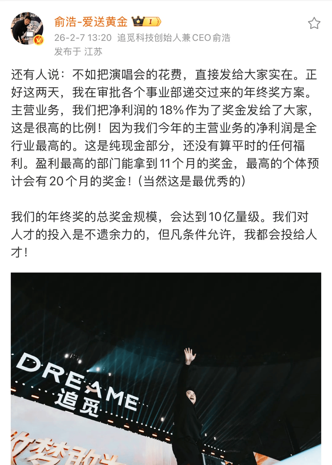 俞浩在回应中提到,“演唱会几千万投入”仅相当于公司“一天研发费用”,并披露了公司年终奖方案:主营业务将拿出“净利润的18%”作为奖金发放,且为“纯现金部分”,不包含平时福利。