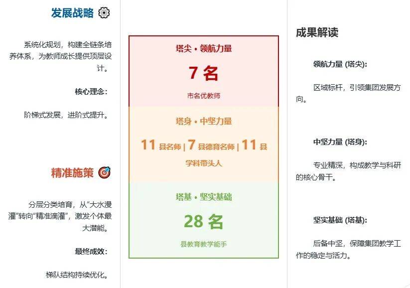 2025年,实小集团教师发展中心锚定教师专业成长核心,深耕梯队建设、分层精准培育,助力各学段教师阶梯式发展、进阶式提升。集团现有市名优教师7名,县名师11名,县德育名师7名,县学科带头人11名,县教育教学能手28名。各项师资指标均实现稳步增长,名优教师梯队结构持续优化,形成了“金字塔式”的名优教师集群。这背后,是学校教师发展中心系统化设计、分层分类精准施策的扎实推进。