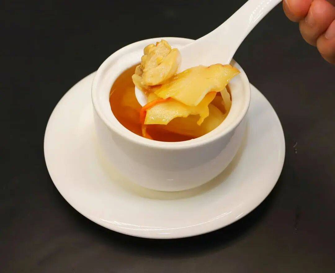 来了新锦江才知道,原来乳鸽还有那么多吃法,将乳鸽与花旗参片同入陶盅,隔水慢炖。汤色清亮如茶,入口却醇厚温润,花旗参的微苦回甘恰到好处地中和油腻,只留下满口甘香。