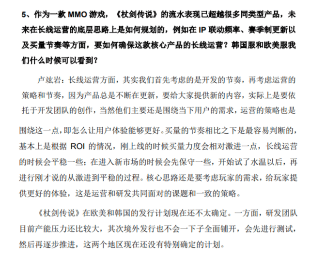 彼时,有投资者提出《杖剑传说》的长期运营规划问题。卢竑岩对此并未给出明确的答案,直言“其实我们首先考虑的是开发的节奏,再考虑运营的策略和节奏”。