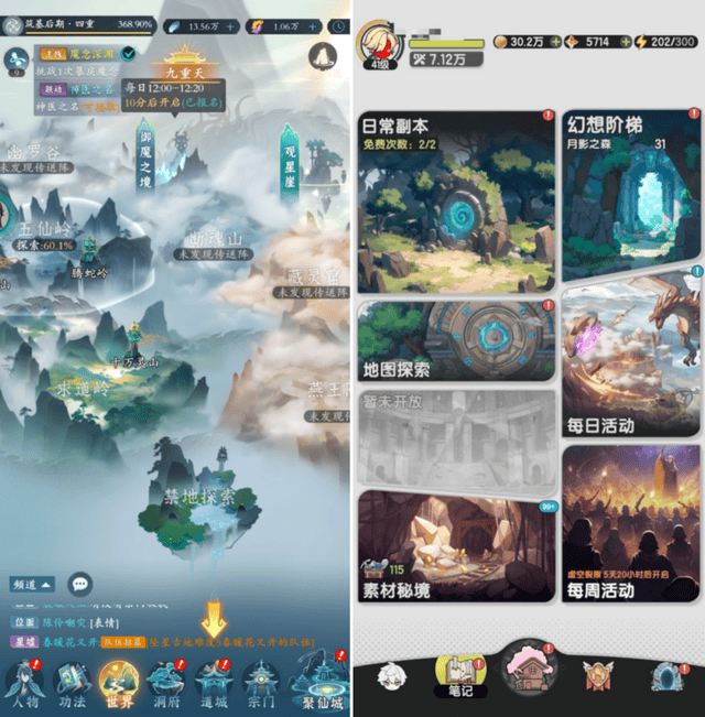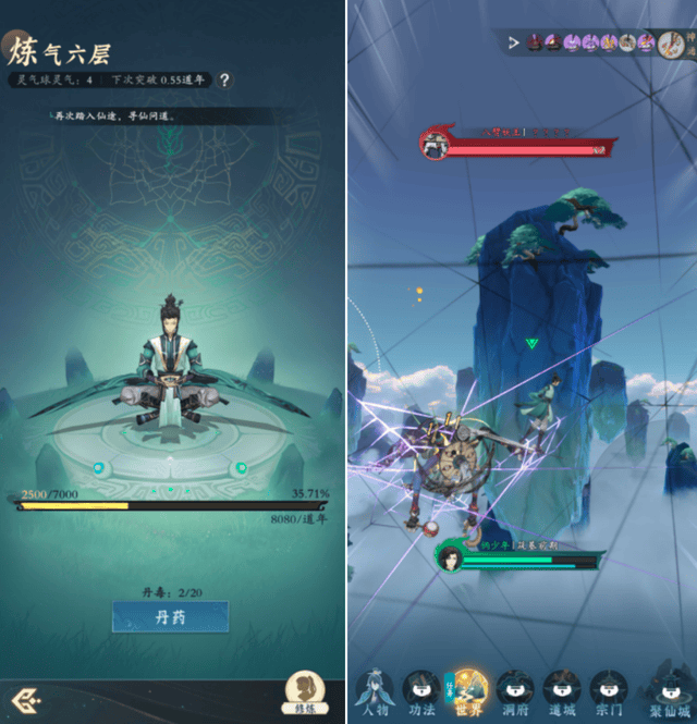 《问剑长生》修炼主线任务,伴随大量的剧情环节,虽可以直接跳过,加上本身各类界面普遍需要进行多次跳转操作,意味着占用玩家不少时间。相比之下,《杖剑传说》简化剧情任务,绝大部分战斗环节自动跳设定跳过,开启副本给出了明确的战力数值。